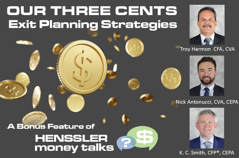 Henssler CPAs & Advisers Tax Partner John Dickson, CPA, CFP®, CVA, joins Troy Harmon, CFA, CVA, Nick Antonucci, CVA, CEPA, and K.C. Smith, CFP®, CEPA on Our Three Cents to discuss how to manage the taxes business owners face when entering a transaction to exit their business when retiring or entering a new business. Without the right professionals on board, business owners may not know how the tax impact will change depending on how the deal is structured.